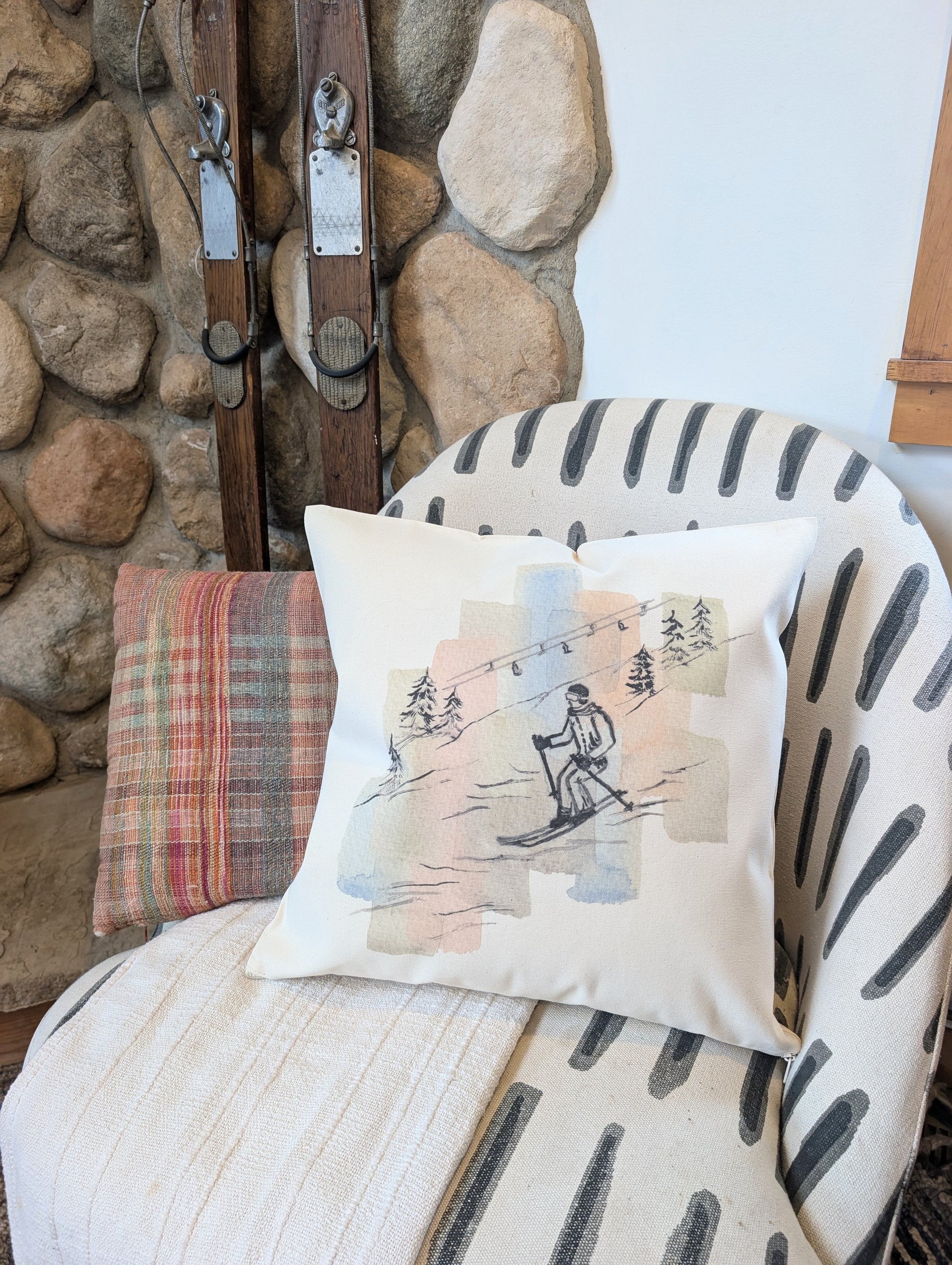 Skier and Ski Lift Watercolor Art Printed Canvas Pillow
